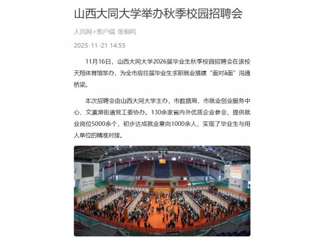11月16日,山西大同大学2026届毕业生秋季校园招聘会在该校天翔体育馆举办,为全市应往届毕业生求职就业搭建“面对面”沟通桥梁。