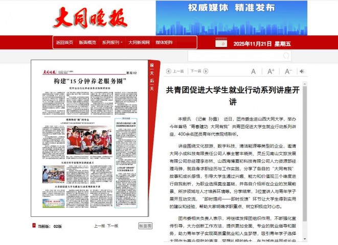 本报讯 (记者 孙露) 近日,团市委走进山西大同大学,举办今年首场“青春建功 大同有我”共青团促进大学生就业行动系列讲座,400余名团员青年代表现场聆听。