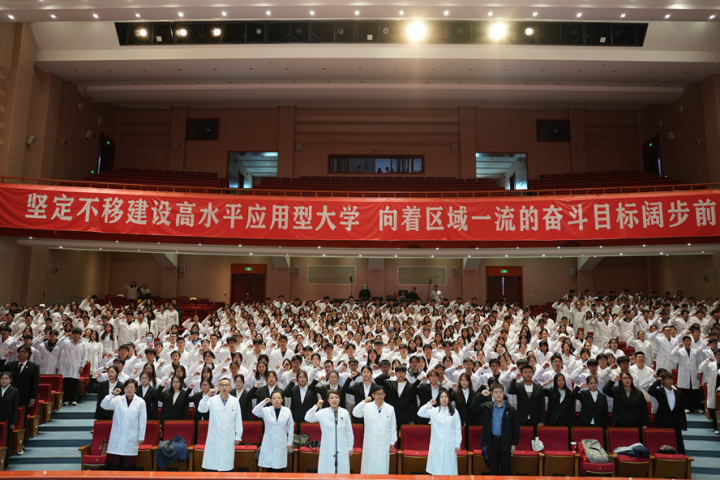 全体师生共同宣誓《医学生誓言》,誓言铿锵有力、掷地有声,承诺将恪守医德准则、刻苦钻研医术、关爱服务患者,正式宣告成为医学院大家庭的一员。