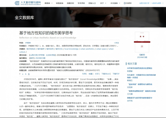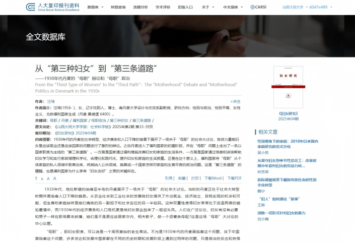 近日,从人大复印报刊资料中心传来喜讯,《山西大同大学学报(社会科学版)》刊发的2篇论文被人大复印报刊资料全文转载,齐晓坤的《基于地方性知识的城市美学思考》一文被《美学》2024年第3期全文转载;汪琦的《从“第三种妇女”到“第三条道路”——1930年丹麦的“母职”辩论和“母职”政治》一文被《妇女研究》2025年第4期全文转载。另外,2024年度刊发文章中有167篇文章入选该资料题目索引,充分彰显了我校社科版学报刊发论文的学术创新性、前沿性得到学界的高度认可,学术影响力持续提升。