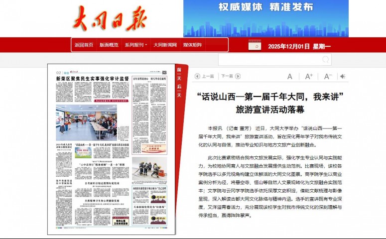 本报讯 (记者 董芳) 近日,大同大学举办“话说山西——第一届千年大同,我来讲”旅游宣讲活动,旨在深化青年学子对我市传统文化的认同与自信,推动专业知识与地方文旅产业创新融合。