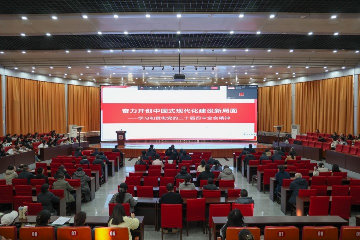 为深入学习贯彻党的二十届四中全会精神,深刻领会党中央关于国家治理体系和治理能力现代化的重大决策部署,准确把握未来发展方向,激发全校党员干事创业的澎湃动力,11月28日,我校举办党的二十届四中全会精神专题培训,全校党员同上一堂党课,并同步开展2025年度全校党委理论学习中心组学习秘书培训。本次培训采用“主会场+分会场”视频同步直播形式,在慎思楼报告厅设主会场,并在各二级党组织设立37个分会场,确保3000余名师生党员实现全覆盖、同频共振的学习。