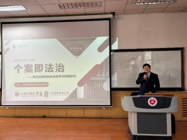 11月28日,法学院大学生法治专题讲座在明哲楼203教室举行。北京安剑律师事务所知名律师、学校法律顾问周兆成受邀担任主讲,法学院和马克思主义学院部分师生参加。