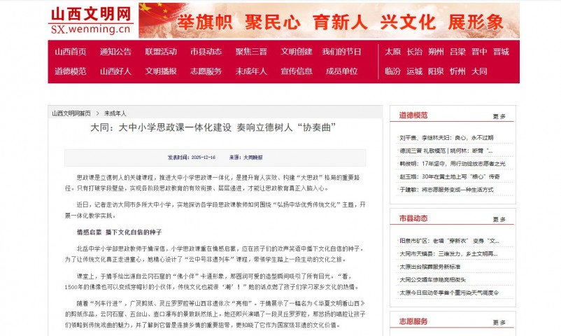 近日,记者走访大同市多所大中小学,实地探访各学段思政课教师如何围绕“弘扬中华优秀传统文化”主题,开展一体化教学实践。
