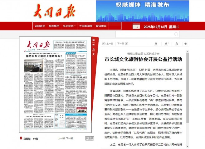 本报讯 (记者 张志忠) 12月14日,大同市长城文化旅游协会组织会员、志愿者及山西大同大学研究生等20余人,驱车深入长城脚下的村落,开展了一场暖意融融的公益走访慰问行活动,为长城沿线乡亲送去祝福与关怀。