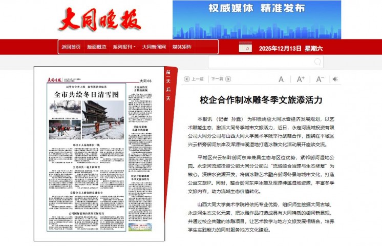 山西大同大学美术学院将依托专业优势,组织师生挖掘大同古城、永定河生态文化元素,把冰雕作品打造成具有大同特质的御河新景观,并通过校企共建的冰雕项目,让艺术教学与地方文旅发展相结合,培养学生实践能力的同时服务地方文化建设。