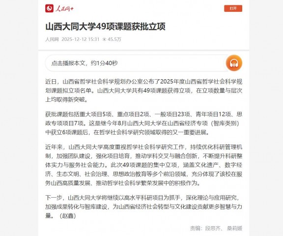 下一步,山西大同大学将继续以高水平科研项目为抓手,深化理论与应用研究,加强成果转化与智库建设,为山西省经济社会转型与文化建设贡献更多智慧与力量。(赵鑫)