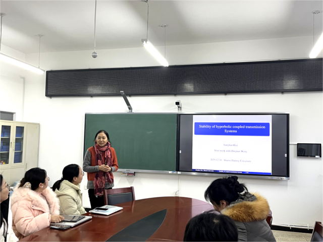 12月16日,应用数学研究所举办偏微分方程学术报告会。山西大学郝江浩教授应邀作题为“双曲方程耦合传输系统的稳定性”的报告,系统分享了其团队在双曲方程稳定性分析领域的最新研究成果。报告由康淑瑰教授主持,学院相关领域教师参加。