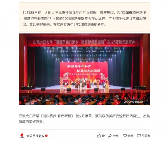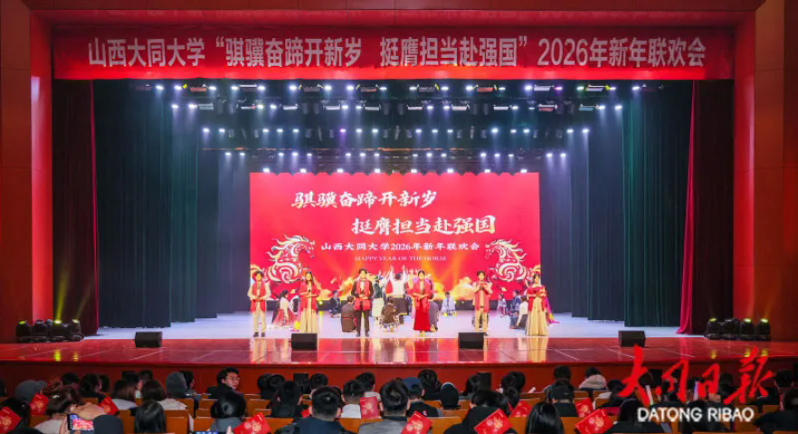 12月28日晚,大同大学本真楼演播厅内灯火璀璨、喜庆热闹,以“骐骥奋蹄开新岁 挺膺担当赴强国”为主题的2026年新年联欢会在此举行,广大师生代表共赏精彩演出、共话美好未来,在欢声笑语中迎接即将到来的新年。