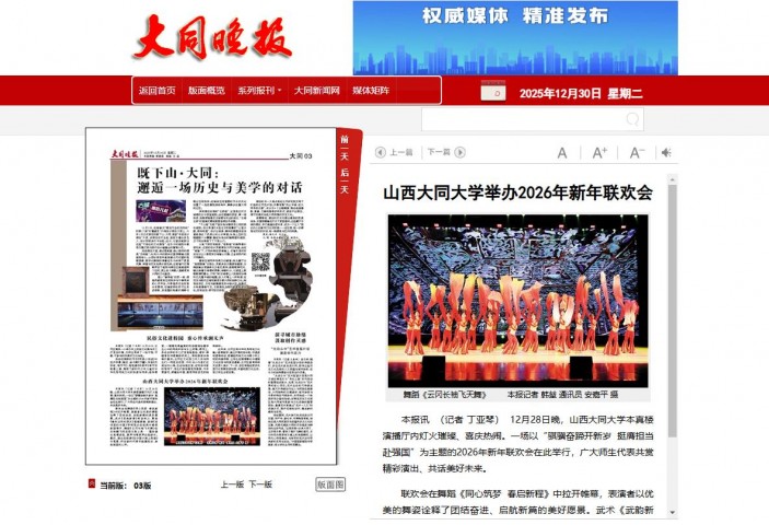 本报讯 (记者 丁亚琴) 12月28日晚,山西大同大学本真楼演播厅内灯火璀璨、喜庆热闹。一场以“骐骥奋蹄开新岁 挺膺担当赴强国”为主题的2026年新年联欢会在此举行,广大师生代表共赏精彩演出、共话美好未来。