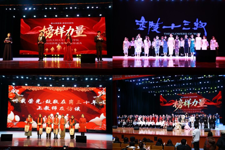 12月24日晚,外国语学院2026年“薪火照前路 新语启新程”迎新晚会暨年度表彰盛典在本真楼演播厅温情启幕。学院以晚会为载体,创新“舞台思政”育人模式,将榜样力量融入艺术表达,让这场青春盛会既有欢声笑语,更有铸魂育人的意义。