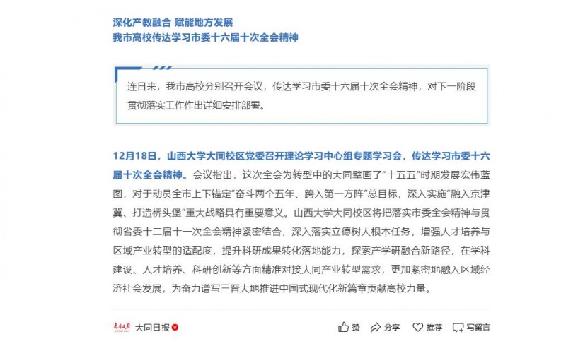 12月18日,山西大学大同校区党委召开理论学习中心组专题学习会,传达学习市委十六届十次全会精神。会议指出,这次全会为转型中的大同擘画了“十五五”时期发展宏伟蓝图,对于动员全市上下锚定“奋斗两个五年、跨入第一方阵”总目标,深入实施“融入京津冀、打造桥头堡”重大战略具有重要意义。山西大学大同校区将把落实市委全会精神与贯彻省委十二届十一次全会精神紧密结合,深入落实立德树人根本任务,增强人才培养与区域产业转型的适配度,提升科研成果转化落地能力,探索产学研融合新路径,在学科建设、人才培养、科研创新等方面精准对接大同产业转型需求,更加紧密地融入区域经济社会发展,为奋力谱写三晋大地推进中国式现代化新篇章贡献高校力量。