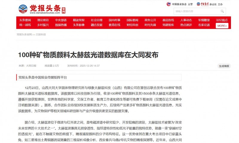 12月23日,山西大同大学固体物理研究所与绿象太赫兹科技(山西)有限公司在晋创谷联合发布100种矿物质颜料太赫兹光谱标准数据库。该数据库以科技创新为引领,收录100种矿物质颜料及其1500余条太赫兹光谱信息,遵循开放获取原则,世界各地的科学家、文保工作者、教育工作者和师生等都可免费下载使用(仅需在论文成果中注明数据来源)。据悉,合作团队会持续加快发展新质生产力,后续将产出更多矿物质颜料太赫兹光谱信息,充实该数据库,为文物保护等相关领域科研创新与产业升级提供更坚实的数据支撑。