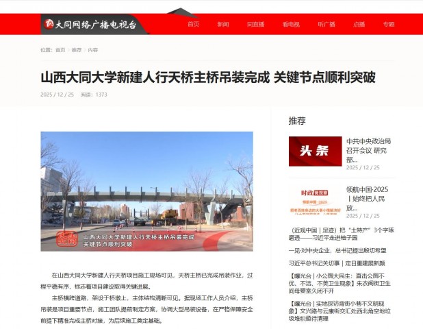 在山西大同大学新建人行天桥项目施工现场可见,天桥主桥已完成吊装作业,过程平稳有序,标志着项目建设取得关键进展。
