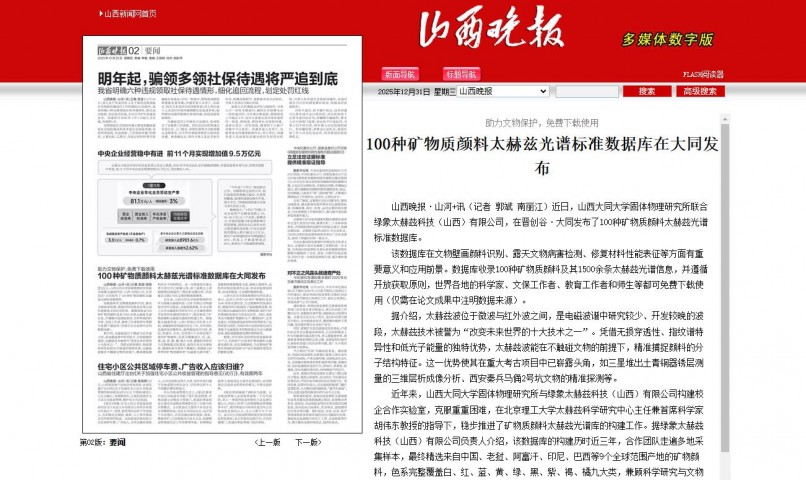 山西晚报·山河+讯(记者 郭斌 南丽江)近日,山西大同大学固体物理研究所联合绿象太赫兹科技(山西)有限公司,在晋创谷·大同发布了100种矿物质颜料太赫兹光谱标准数据库。该数据库在文物壁画颜料识别、露天文物病害检测、修复材料性能表征等方面有重要意义和应用前景。数据库收录100种矿物质颜料及其1500余条太赫兹光谱信息,并遵循开放获取原则,世界各地的科学家、文保工作者、教育工作者和师生等都可免费下载使用(仅需在论文成果中注明数据来源)。