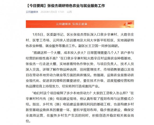 1月5日,区委副书记、区长张俊杰带队深入口泉乡辛寨村、大路辛庄村、区零工市场、云冈亲人培训基地及大同大学新平旺校区,实地调研特色农业种植、就业服务等重点工作。副区长王卫国一同参加调研。