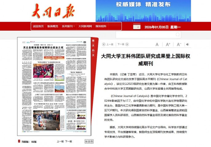 本报讯 (记者 丁亚琴) 近日,大同大学化学与化工学院教师王科伟团队研究论文成功发表于国际高水平期刊《Chinese Journal of Catalysis》,该论文以2023级研究生谢文奥为第一作者,由王科伟教授联合华中科技大学王笑颜副研究员、山西大学车瑜博士共同指导完成。