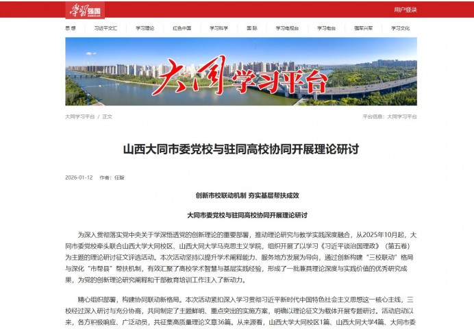 为深入贯彻落实党中央关于学深悟透党的创新理论的重要部署,推动理论研究与教学实践深度融合,从2025年10月起,大同市委党校牵头联合山西大学大同校区、山西大同大学马克思主义学院,组织开展了以学习《习近平谈治国理政》第五卷 为主题的理论研讨征文评选活动。本次活动坚持以提升学术阐释能力、服务地方发展为导向,通过创新构建“三校联动”格局与深化“市帮县”帮扶机制,有效汇聚了高校学术智慧与基层实践经验,形成了一批兼具理论深度与实践价值的优秀研究成果,为党的创新理论研究阐释和干部教育培训工作注入了新动力。