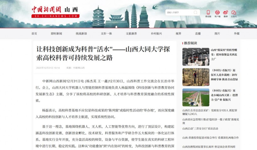 中新网山西新闻12月31日电 (杨杰英 王一鑫)12月30日,山西科普工作交流会在长治市举行。会上,山西大同大学机器人与智能控制科普基地负责人杨磊围绕《科技创新与科普教育协同发展新生态》主题,分享了该校将高校的科研创新、人才培养与科普教育深度融合的系统性探索。