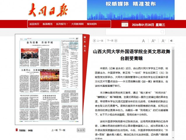 本报讯(记者 赵永宏)近日,由山西大同大学学生工作部、校团委主办,外国语学院、新正苑“一站式”学生社区新三(北)功能型党支部承办,大同市大剧院管理中心支持的学生社区首届外语文化艺术节重点活动——外文思政舞台剧《赵一曼》首场演出,在该校本真楼演播厅举行。