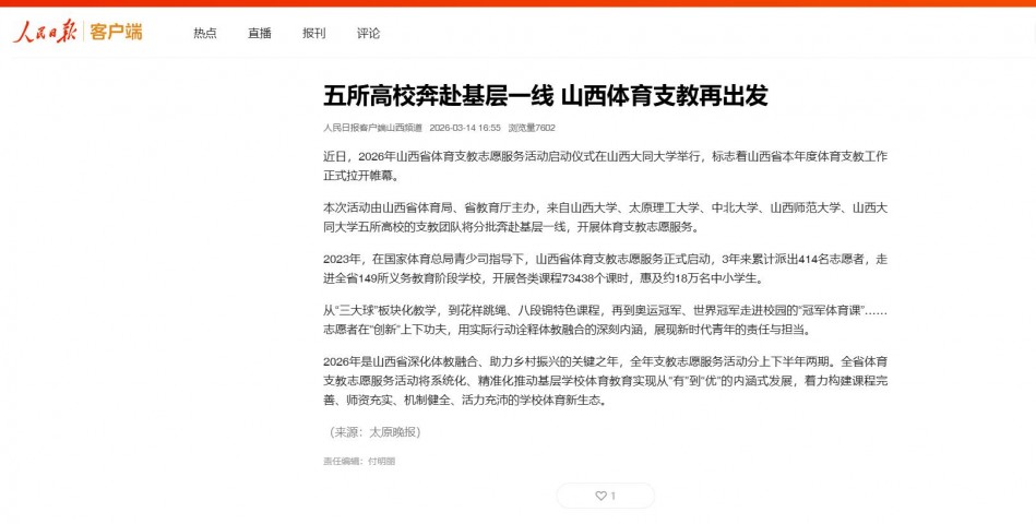 近日,2026年山西省体育支教志愿服务活动启动仪式在山西大同大学举行,标志着山西省本年度体育支教工作正式拉开帷幕。