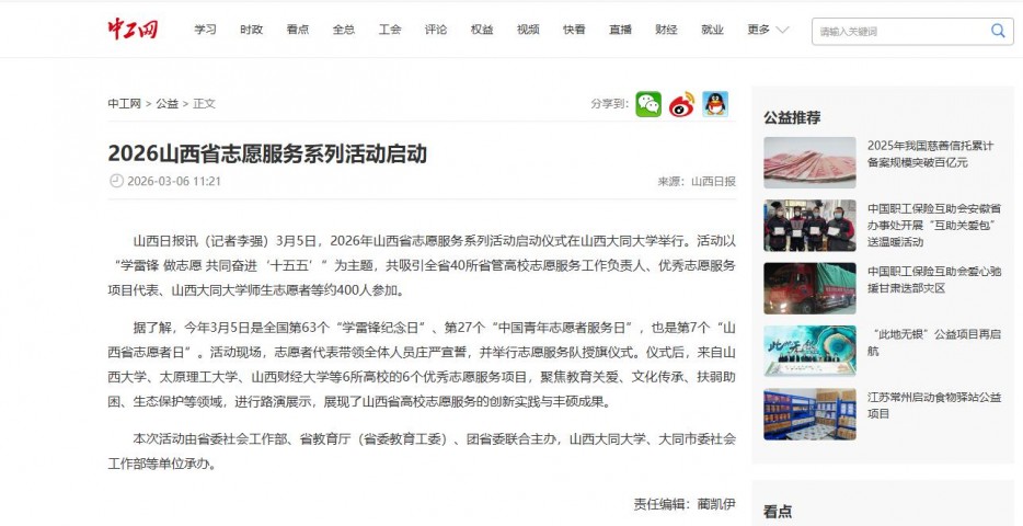 山西日报讯(记者李强)3月5日,2026年山西省志愿服务系列活动启动仪式在山西大同大学举行。活动以“学雷锋 做志愿 共同奋进‘十五五’”为主题,共吸引全省40所省管高校志愿服务工作负责人、优秀志愿服务项目代表、山西大同大学师生志愿者等约400人参加。