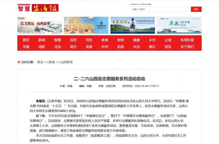 本报讯(记者李强)3月5日,2026年山西省志愿服务系列活动启动仪式在山西大同大学举行。活动以“学雷锋 做志愿 共同奋进‘十五五’”为主题,共吸引全省40所省管高校志愿服务工作负责人、优秀志愿服务项目代表、山西大同大学师生志愿者等约400人参加。
