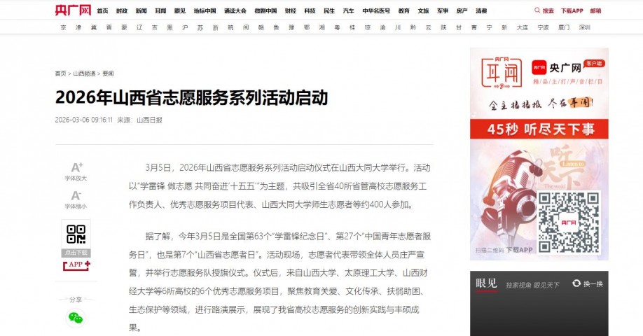 3月5日,2026年山西省志愿服务系列活动启动仪式在山西大同大学举行。活动以“学雷锋 做志愿 共同奋进‘十五五’”为主题,共吸引全省40所省管高校志愿服务工作负责人、优秀志愿服务项目代表、山西大同大学师生志愿者等约400人参加。