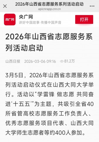 3月5日,2026年山西省志愿服务系列活动启动仪式在山西大同大学举行。活动以“学雷锋 做志愿 共同奋进‘十五五’”为主题,共吸引全省40所省管高校志愿服务工作负责人、优秀志愿服务项目代表、山西大同大学师生志愿者等约400人参加。