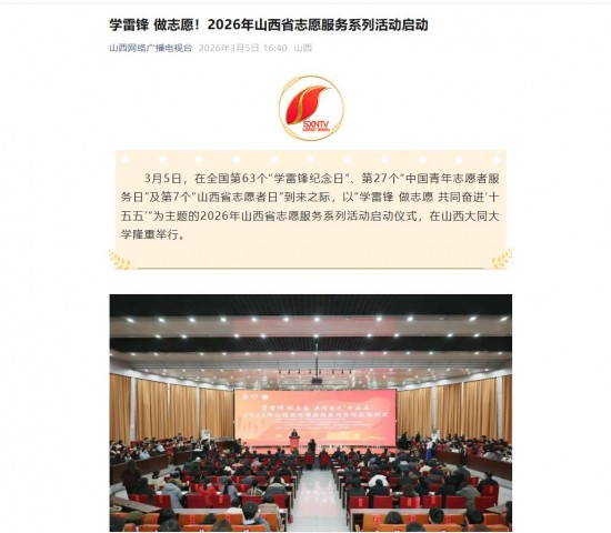 3月5日,在全国第63个“学雷锋纪念日”、第27个“中国青年志愿者服务日”及第7个“山西省志愿者日”到来之际,以“学雷锋 做志愿 共同奋进‘十五五’”为主题的2026年山西省志愿服务系列活动启动仪式,在山西大同大学隆重举行。