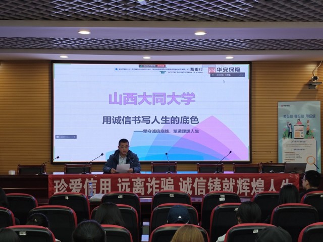 为深入贯彻落实国家关于校园金融安全教育的工作要求,切实提升大学生金融风险防范能力,3月20日,学工部邀请山西省邮政储蓄银行合作委托方华安保险讲师团来我校举办“诚信贷款,守护美好校园”主题金融知识宣讲会。宣讲会在行知楼0230学术报告厅进行,各学院资助工作人员、200余名学生代表参加宣讲会,新平旺校区学生线上参会。学工部副部长师晓朋主持讲座。