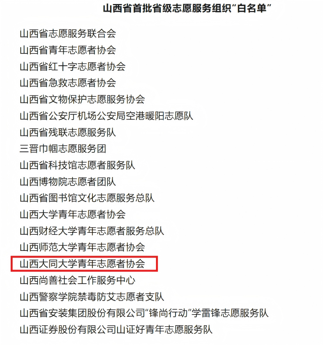 近日,中共山西省委社会工作部向社会集中公布山西省首批省级志愿服务组织“白名单”,我校青年志愿者协会成功入选。
