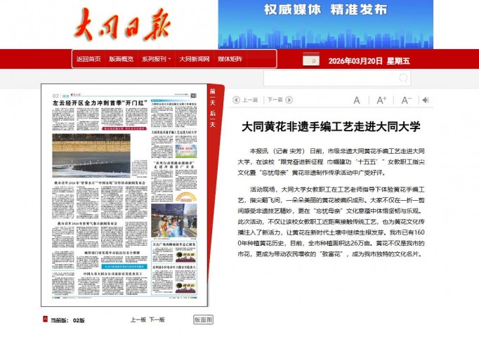 本报讯 (记者 宋芳) 日前,市级非遗大同黄花手编工艺走进大同大学,在该校“跟党奋进新征程 巾帼建功‘十五五’”女教职工指尖文化暨“忘忧母亲”黄花非遗制作传承活动中广受好评。