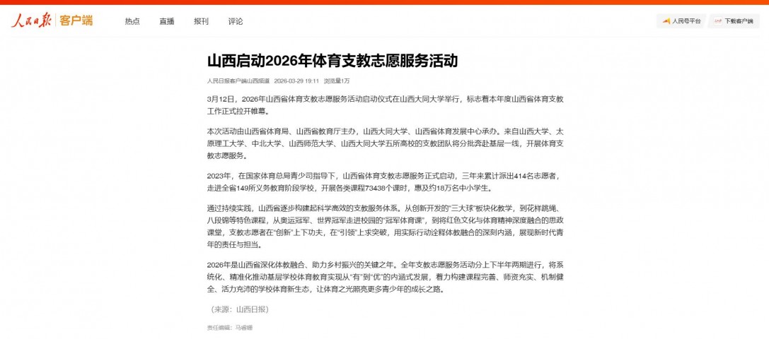 3月12日,2026年山西省体育支教志愿服务活动启动仪式在山西大同大学举行,标志着本年度山西省体育支教工作正式拉开帷幕。