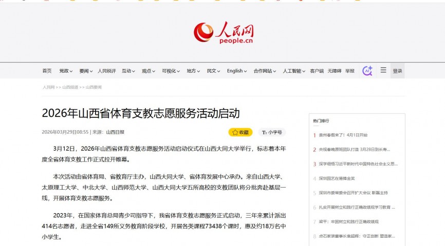 3月12日,2026年山西省体育支教志愿服务活动启动仪式在山西大同大学举行,标志着本年度全省体育支教工作正式拉开帷幕。