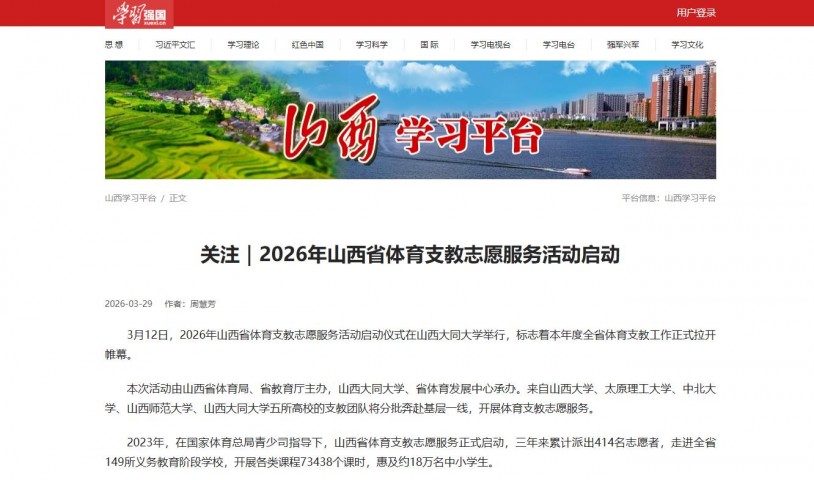 3月12日,2026年山西省体育支教志愿服务活动启动仪式在山西大同大学举行,标志着本年度全省体育支教工作正式拉开帷幕。