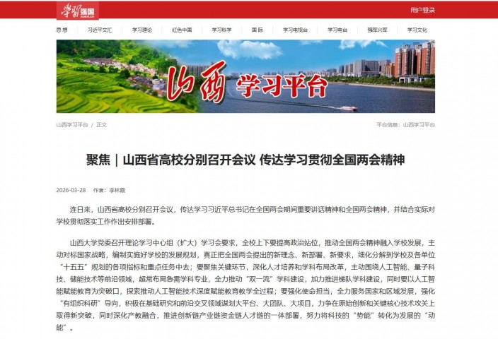 山西大学党委召开理论学习中心组(扩大)学习会要求,全校上下要提高政治站位,推动全国两会精神融入学校发展,主动对标国家战略,编制实施好学校的发展规划,真正把全国两会提出的新理念、新部署、新要求,细化分解到学校及各单位“十五五”规划的各项指标和重点任务中去;要聚焦关键环节,深化人才培养和学科布局改革,主动围绕人工智能、量子科技、储能技术等前沿领域,超常布局急需学科专业,全力推动“双一流”学科建设,加力推进梯队学科建设,同时要以人工智能赋能教育为突破口,探索推动人工智能技术深度赋能教育教学全过程;要强化使命担当,全力服务国家和区域发展,强化“有组织科研”导向,积极在基础研究和前沿交叉领域谋划大平台、大团队、大项目,力争在原始创新和关键核心技术攻关上取得新突破,同时深化产教融合,推进创新链产业链资金链人才链的一体部署,努力将科技的“势能”转化为发展的“动能”。