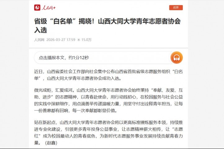 站在新起点,山西大同大学青年志愿者协会将以更高标准锤炼服务本领,持续推进专业化建设,引领更多青年投身公益事业,让志愿精神薪火相传,让“志愿红”成为校园最动人的青春底色,为新时代志愿服务事业发展持续贡献青春力量。(赵鑫)