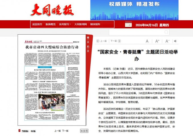 本报讯 (记者 孙露) 近日,团市委联合市国家安全人民防线建设领导小组办公室、山西大同大学团委,在和阳门内广场举办“国家安全·青春挺膺”主题团日示范活动。