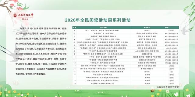 为贯彻落实《全民阅读促进条例》,引导全校师生亲近书籍、品读经典、涵养品格,形成爱读书、读好书、善读书的浓厚氛围,积极推动书香校园建设,在首个“全民阅读活动周”来临之际,我校图书馆联合相关部门、学院,于4月23日正式启动2026年“全民阅读活动周”系列活动,拉开为期一个月的全民阅读活动序幕。