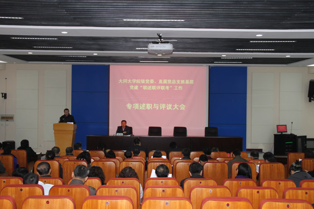 11月14日,校党委在善美楼6层会议室召开了全校2014年度院级党委、直属党总支抓基层党建“联述联评联考”工作专项述职与评议大会,校党委委员王守义、常乃军、冯锋、郭永、程品、闫世忠出席,党群职能处室负责人、各学院党委书记及副书记、各直属党总支书记,党员代表、群众代表等参加了会议。