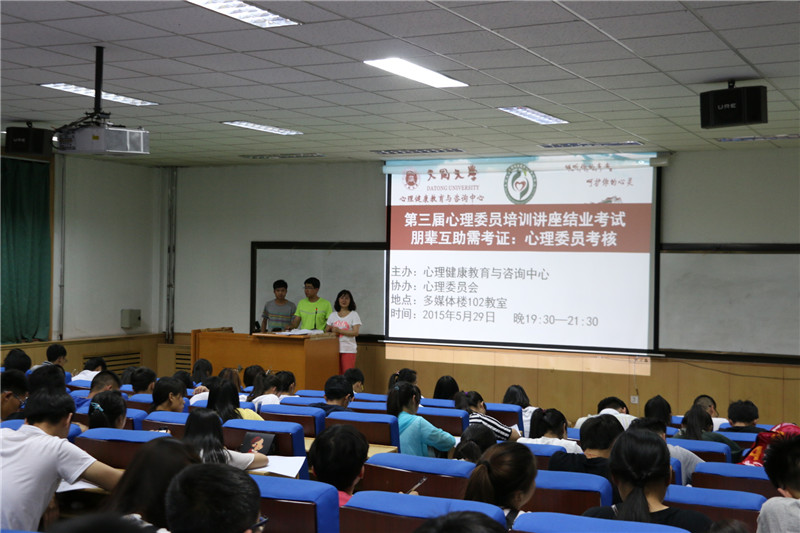 为了加强各学院心理委员心理知识的学习,培养技能和责任意识,传递积极的心理健康能量,心理健康教育与咨询中心在“5·25”心理健康月活动期间开设了四场心理学讲座和一次素质拓展训练。5月29日晚,在培训结束后,由心理健康教育与咨询中心组织的第三期心理委员培训考核在多媒体教学楼102教室进行。