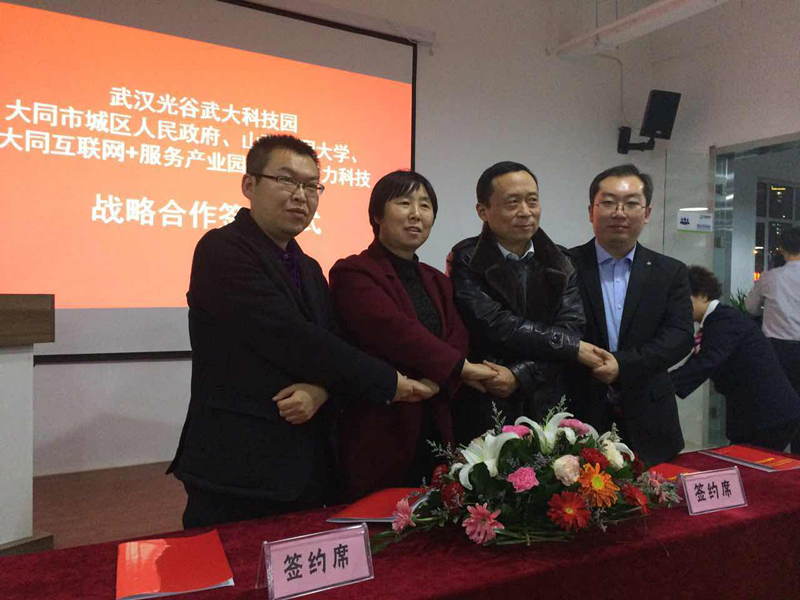 2017年1月12日下午在大同互联网+服务产业园,我校与武汉光谷武大科技园有限公司、大同市万城众创有限公司、大同市天宣聚力科技有限责任公司签定了四方战略合作框架协议。校领导姚丽英、翟大彤及相关职能部门负责人,城区郭雁明副区长、韩杰副区长、万城集团董事长苏志远等参加了签约仪式。