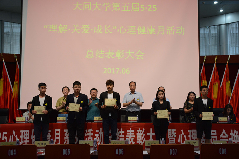 与会领导、嘉宾为本年度活动的先进个人、十佳心理委员、心理情景剧大赛等活动的获奖者颁发了奖杯和奖状。