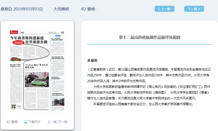 大同大学版画教研室青年教师师耀平的《南山系列》和张敏的《甘庄煤矿两矿工》两件版画作品被评为优秀作品。大同大学教师乔彬的《清供图》、大同大学学生高妮的《巷者》等作为入选作品参展,本次展览也是大同大学美术学院师生的一次艺术风采展示。