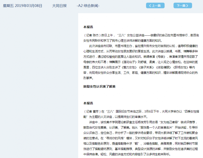 (记者 董芳)在“三八”国际妇女节来临之际,3月6日下午,大同大学举办以“四季女性搭配”为主题的人文讲座,以提高师生们的审美水平。