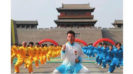2018年,于强国与我市千余名健身气功爱好者在南城墙关城内展示健身气功(资料照片)
