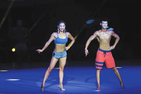 李胜红(女)在大同大学第12届校园文化艺术节闭幕式上展示健身健美(资料照片)