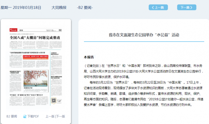 (记者刘剑)在“世界水日”和“中国水周”即将到来之际,由山西高校传媒联盟、市水务局、山西大同大学主办的2019水公益计划·大同大学水公益活动昨日在文瀛湖生态公园举行,呼吁市民珍惜水资源、保护水环境。