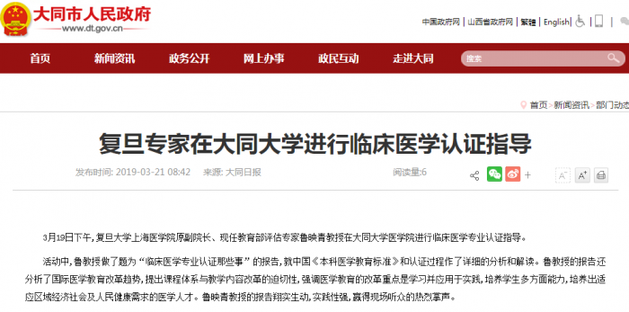 3月19日下午,复旦大学上海医学院原副院长、现任教育部评估专家鲁映青教授在大同大学医学院进行临床医学专业认证指导。